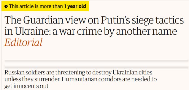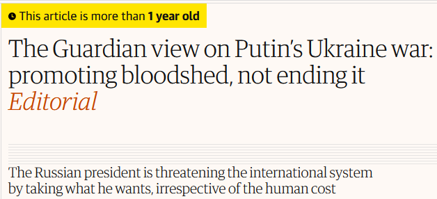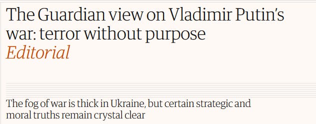 By my count, the UK Guardian has published 54 editorials about the war in Ukraine, with the first one appearing the day that it was launched. We are not going to analyze all of these editorials, as I don’t want to strain your eyes/bore you to death. I will instead give you a cross-section of these editorials, with the beauty being that editorial headlines tell us pretty much all that we need to know about the actual body of the piece. For those who do not trust me, feel free to go through all 54 entries, and report back later with your findings.