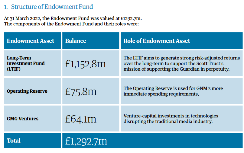 According to the 2021/2022 Scott Trust Endowment Fund Performance Report (.pdf upon request), we learn the following: