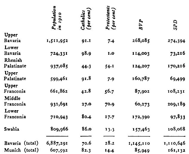 As Mitchell notes, only in and around Munich did the SPD manage to break the confessional barrier, with the SPD drawing the most support. This was still not enough for the SPD to be the outright winner of the vote, as the BVP managed to win a plurality, but in the knowledge that they would not be forming the next government due to a lack of viable coalition partners.