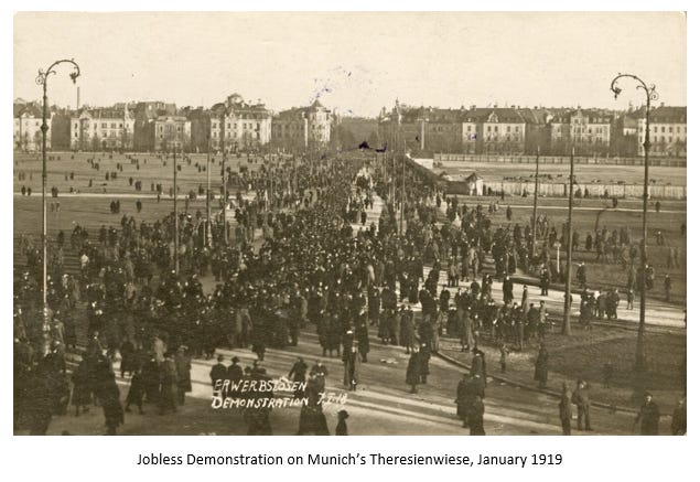 Lots of idle, angry, hungry, and broke men milling about does not make for a good situation. It makes them very prone to radicalization. Compounding this situation was the fact that the ‘reconversion’ of the wartime industry meant that thousands of thousands of workers were, after Eisner’s cabinet dragged their own feet, put out of work because their factories were shut down to retool for non-wartime purposes. As Mitchell describes, the situation by January 1919 in Munich was highly “combustible”.