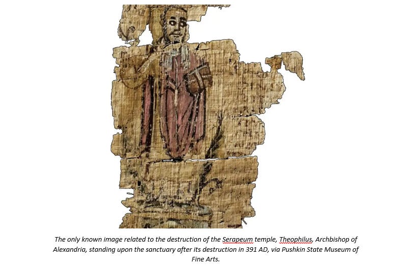 Watts uses the Christian destruction of the Temple of Serapis (Serapeum) in Alexandria in AD 392 to bookend his excellent, excellent history “The Final Pagan Generation”. Throughout this series, we have noticed eerie parallels with today’s West, particularly the USA. They are far too numerous to recount in this single post, meaning that you’ll just have to go through the previous entries if you haven’t done so already.