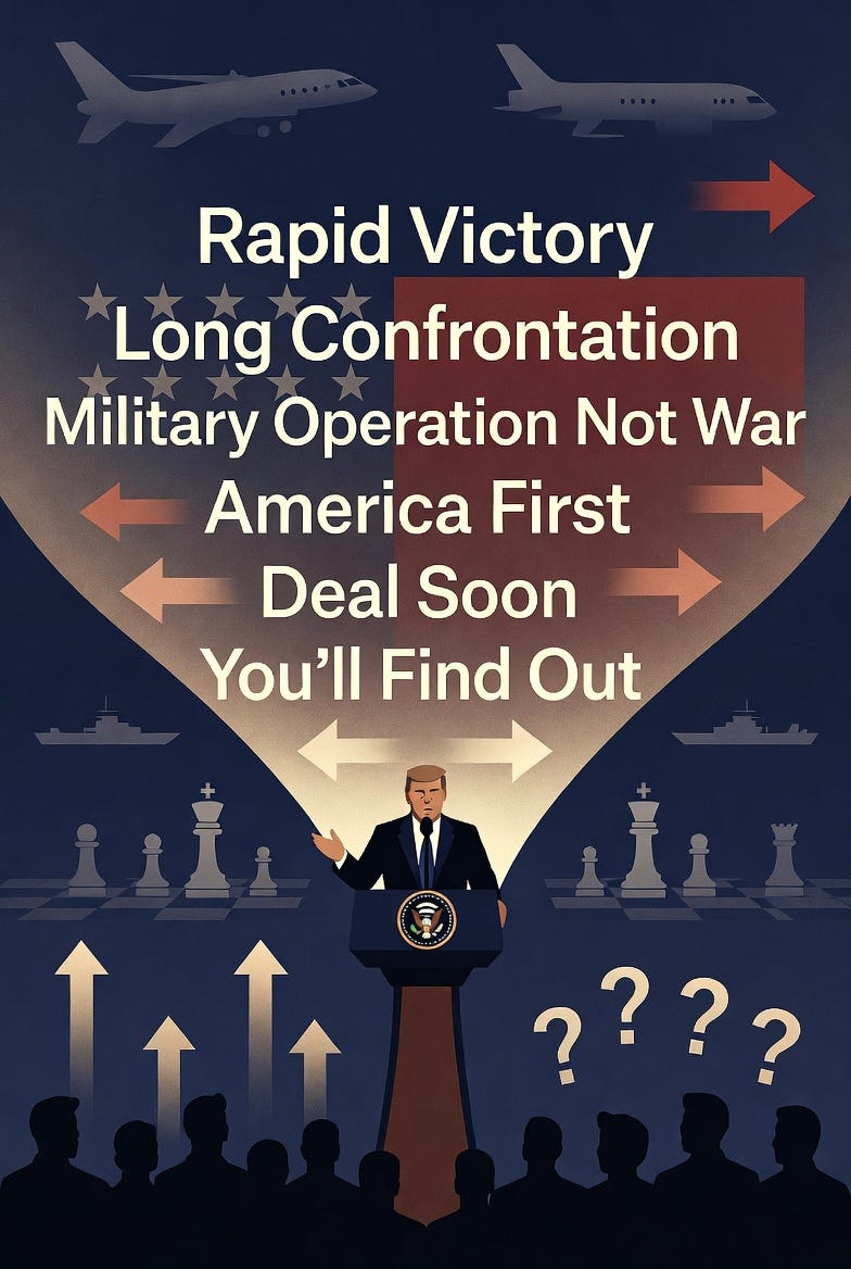 If Vietnam was the “First Televised War”, and if the First Gulf War was the “First 24 Hour News War”, then this showdown can be argued to be the “First Fake News on Social Media War” (admittedly, a cumbersome title that certainly won’t stick). A lack of on-the-ground reporting from credible sources, a social media world that is both monetized to lie for clicks and drowning in partisan alt.media takes that have only a fleeting relationship with reality, and a US regime that is practicing a strategy of communications ambiguity is a perfect recipe for creating frustration. That has been a theme of these past four weeks.
