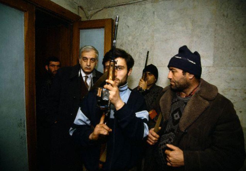 Cracks began to appear in the state’s security services and National Guard, with pro and anti-government lines being drawn. Nationalist paramilitaries camped out near the capital, ready to take down the President. They moved against the parliament building on December 22, 1991, in a coup d'état that eventually toppled Gamsakhurdia two weeks later. Georgia’s first democratically-elected President fled first to Armenia, and then to separatist Chechnya.