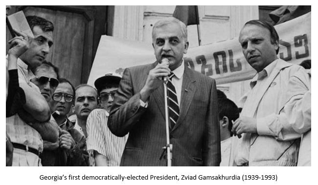 One dissident who rejected compromise with ex-communists was Georgia’s first democratically-elected President, Zviad Gamsakhurdia. A ferocious Georgian nationalist from a very early age, he was never tainted with membership in the Communist Party. Imprisoned at times during the Soviet era, he was under the watchful eye of the KGB the rest of the time as he worked underground to promote human rights and Georgian interests.