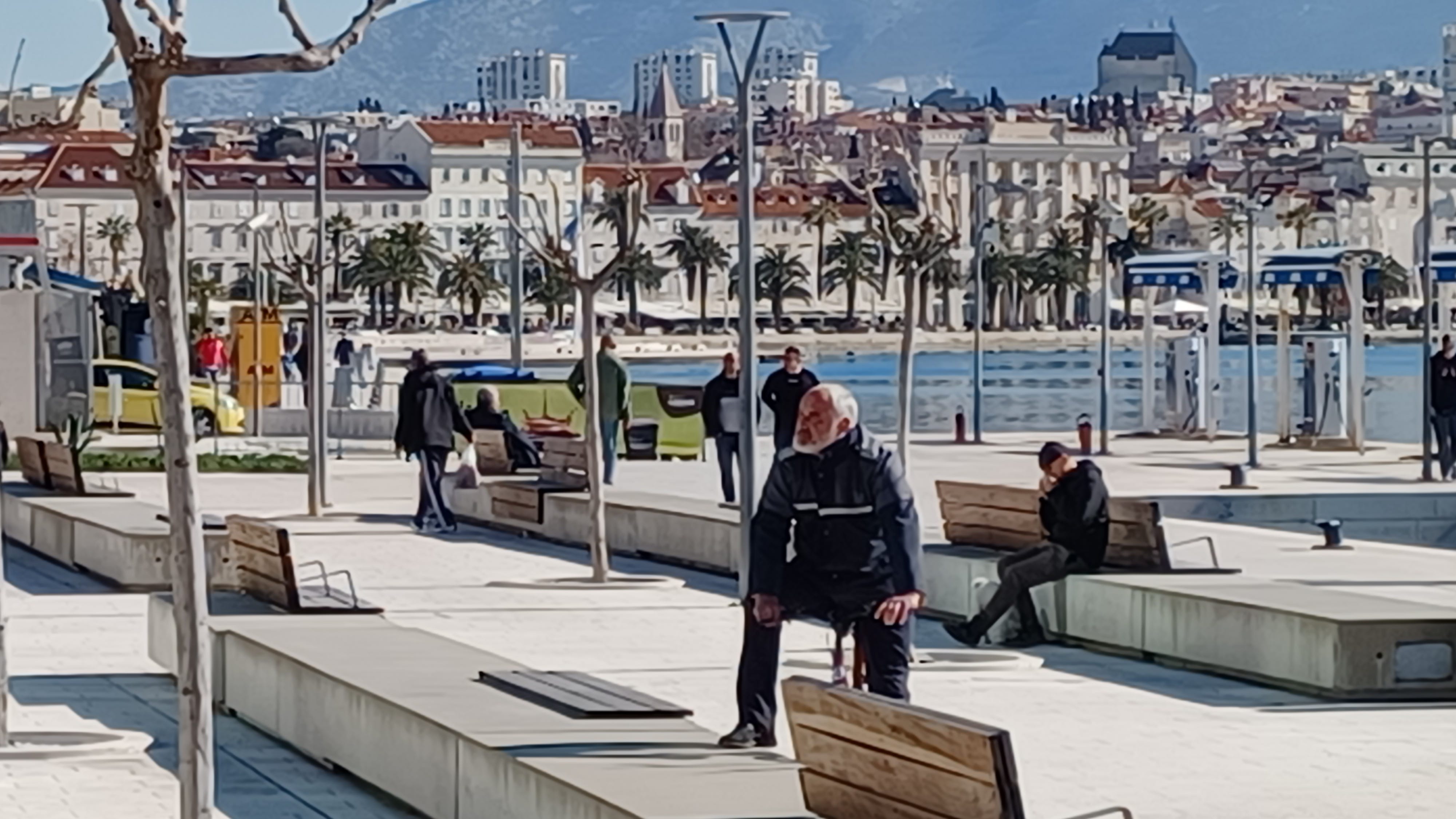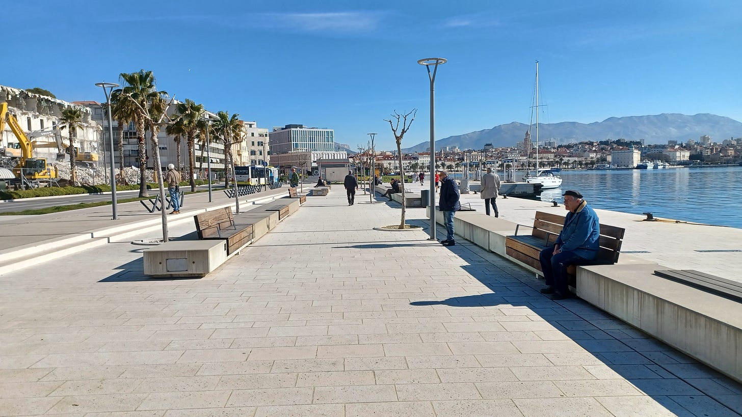 The boardwalk to the left of the photo above is just out of view, but it is used by many to enjoy the view, to get exercise, or to simply sit in the cafes that populate it next to the very turquoise Adriatic Sea. People are out here all day and all night, especially during tourist season.