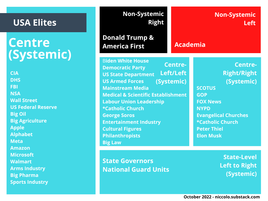 The chart above is very, very simplified (KISS - Keep It Simple, Stupid) and is intended for illustrative purposes. It is not comprehensive. Many of you are going to have a field day disputing the classifications, the definitions, and so on, just like when any publication puts out a list of the “100 Greatest Albums of the 21st Century” or “The 50 Best Movies of the Decade”. I know I placed a land mine under my own feet by doing this, but I am willing to sacrifice myself for the sake of trying to explain a concept. Marxists will scoff at ‘Biden White House’ being centre-left, for example, due to the USA’s capitalist economy. Conservatives will whine that I put a lot of Big Tech in the centrist column despite them embracing DEI and ESG, and censoring pro-Trump media. Some of these elites that are listed can occupy two or more spaces (e.g. Catholic Church for open borders/pro-life). Quibble all you want in the comments…that’s what that section is there for.