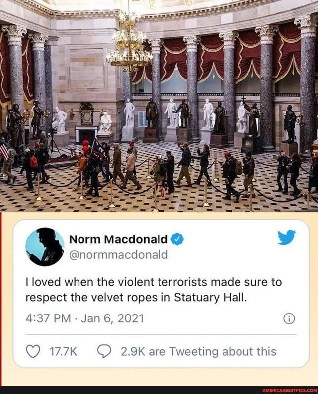 Norm (pbuh) absolutely nails it in one sentence; the notion that this tiny group of people was about to seize Congress is ridiculous to anyone who has two working eyes. Nevertheless, the media went into overdrive to exploit this protest in order to lock out Trump and other future potential systemic challengers by painting it as an ‘insurrection’. To make the threat narrative more robust, Capitol Hill has been significantly militarized, and FBI-ridden ‘right wing groups’ like the Proud Boys, Oath Keepers, etc. are used to create the mirage of ‘violent extremist threats’ (with big assists from gullible and misled men and women).