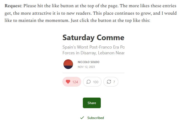 Thank you all for helping me out by hitting the like button at the top (or bottom) of the most recent SCR as I had asked you to do on my behalf. The more likes and comments my entries on this Substack receive, the more attention they get from those not already here. This helps us grow the community through injections of fresh blood, preventing it from going stale. From the last entry: