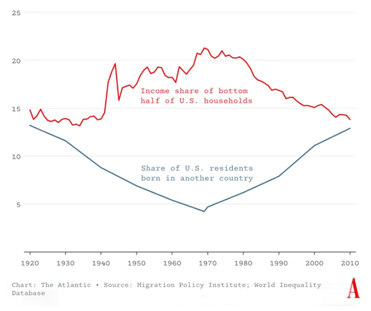 I, like you, enjoy crapping on mainstream media for its decline in quality and how untrustworthy it has become, but sometimes you can find gems in it. For example, this very long essay by David Leonhardt (an excerpt from his new book “Ours Was the Shining Future: The Story of the American Dream”) is an incredibly worthwhile read on the history and impact of immigration in the USA since the 1965 Hart-Celler Act became law. In it, he strikes a moderate tone regarding immigration, but does conclude that it has benefited the wealthier and has negatively impacted the working class: