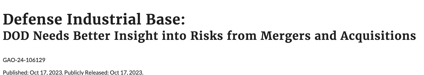 Four hundred mergers every year is a lot, but of course, that’s just an estimate. Why don’t we know how many acquisitions happen in the defense base? As it turns out, it’s an estimate because the Pentagon isn’t tracking defense mergers anymore. To put it in boring GAO-speak, Pentagon “officials could not say with certainty how many defense-related M&A now occur annually because they no longer track or maintain data on all M&A in the defense industrial base.” So the DOD is almost totally blind to the corporate owners of contractors and subcontractors, which might be one reason that, say, Chinese alloys are being discovered in sensitive weapons systems like the state of the art F-35.