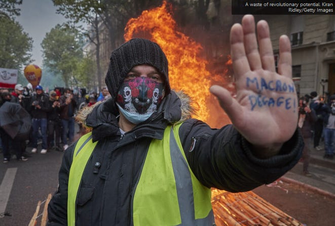 There was a triple paradox at the heart of the original Gilets Jaunes movement. The first was that, while it started and spread rapidly online, it also rescued people from the rural-suburban isolation of their homes. It became a social club as well a social movement. The second is that, although the absence of leaders attracted broad early support, the lack of direction allowed the movement to be hijacked by organised forces, initially from the far-Right, finally by the Left. There were street battles in Lyon, Paris and elsewhere in the New Year between hard-Right and hard-Left urban guerrillas, both groups wearing yellow vests. The Left, partly in the nebulous shape of the Black Bloc movement, eventually won.