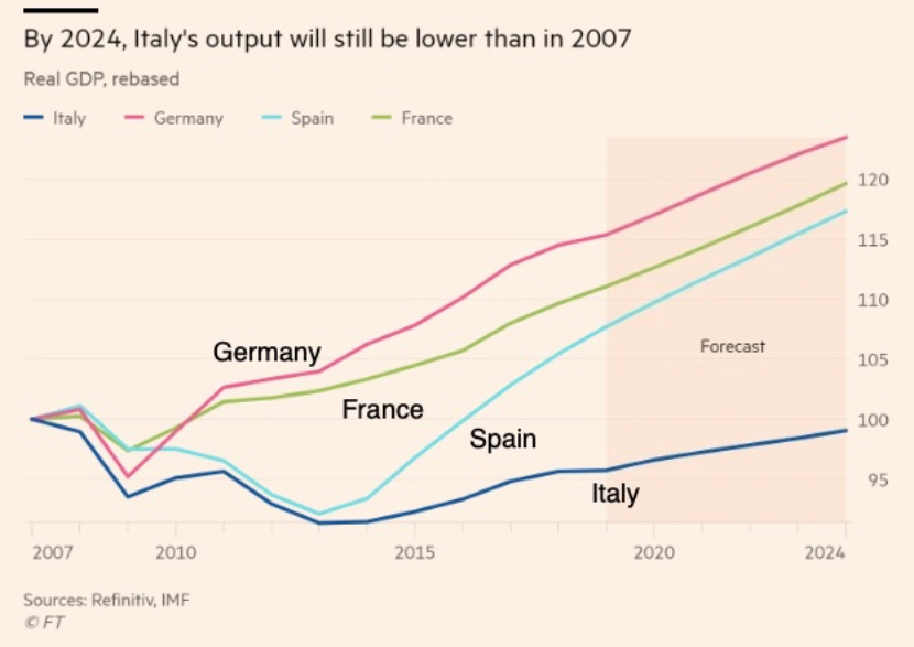 Italy has not fared particularly well in the EU when compared to other large EU states, and has performed very poorly when compared to other large EU states that have adopted the Euro. Italy has for some time now been economically stagnant, with a bloated national debt, and no relief in sight.