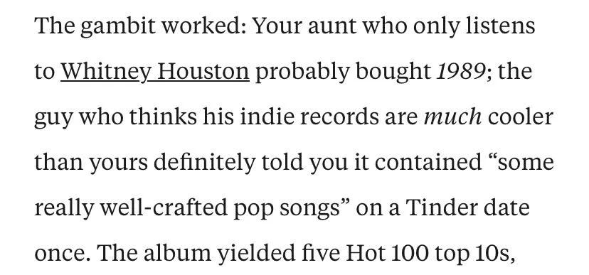 This Pitchfork writer was guilty of doing what Pitchfork did constantly in its last years: fighting a battle that had been won years and years ago, the battle of pop supremacy against supposedly-snootier challengers like indie or just “rock.” The Pitchfork collective didn’t so much pick a side and fight for it, but rather fought for the quaint notion that there were still other sides left to fight. This is a going concern, in the 21st century - helping people preserve the appearance of various cultural skirmishes after they stop being salient because they feel comforted by fighting them. But Taylor Swift had won a flawless victory, an unqualified victory, long before she decided to start re-recording albums. “Indie rock” would have signaled an unconditional surrender but there was no one left around to do so. In this way, large parts of the music press reminds me very much of those Japanese soldiers who kept fighting years after the American victory, unwilling to believe that the battle was over - only here, the problem was not a refusal to believe that they had lost, but a refusal to believe that they had won.