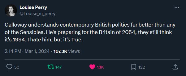 I remember watching and listening to George Galloway in the early 2000s and thinking something along the lines of “this slimy Bolshevik is among the lowest forms of human being, even by politician standards.” Now I’m reading about his current activities and, well, at least he has the virtue of being consistent.