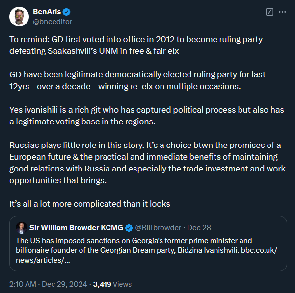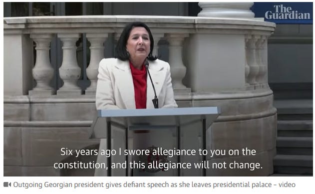 Protests are still ongoing in Georgia, but it seems like the new government is not going to fall, as they have sworn in a new President, and the previous one is willing to leave the building (but will continue to insist that she is the only real “legitimate” President of Georgia).