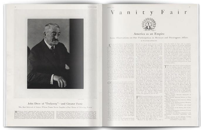 The theme of this weekend’s Substack is US Empire, so why don’t we take a look back to its earlier days? Walter Lippmann’s reputation is known to all, and in 1927 he wrote a piece for Vanity Fair in which he delved into the subject of American meddling in both Mexico and Nicaragua (some things never change, it seems).