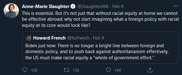 And this brings me back to Anne-Marie Slaughter’s tweet up above. With Biden saying that the lines between foreign and domestic policy continue to blur, and with the USA the global hegemon, why shouldn’t domestic crusades become international ones? After all, that is what is demanded by consistency. Biden is kicking into high gear the internal transformation of America from a White and Christian state into a multi-ethnic, multi-racial, and secular global empire. Racism is the greatest sin of this new theology-ideology and slavery its Original Sin. And if its values are universal, then they must be imposed on the rest of the globe, either through diplomacy, coercion, or violence.