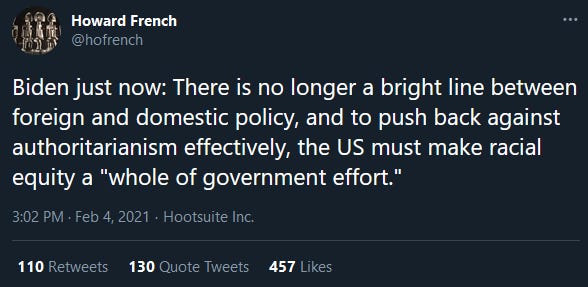 There is a bit of sleight-of-hand in this one by Howard French as he is condensing three different parts of Biden’s speech at the US State Department from this past Thursday into one bit-sized morsel for us to savour. Yet it is not completely dishonest.